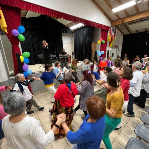 L’ensemble vocal Babelika (à gauche) et nos bénévoles dansant (à droite)